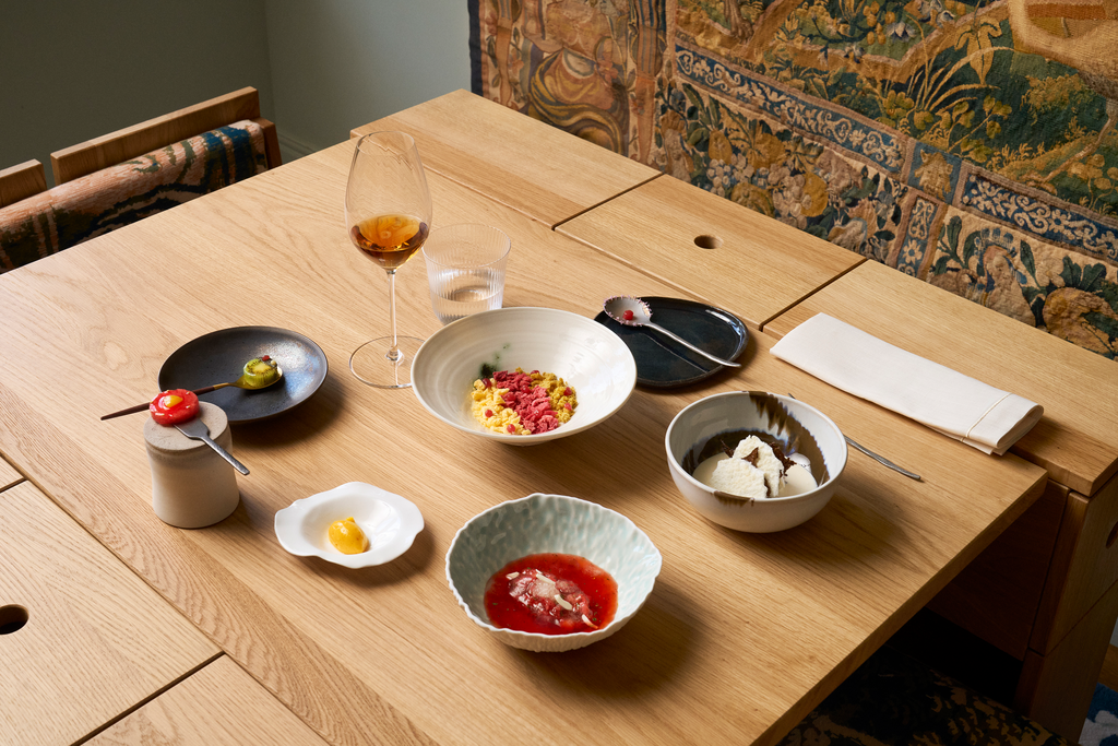 The menu was designed to accompany cognacs created exclusively for the experience (500 euros per person). Wine or champagne pairings are also available.